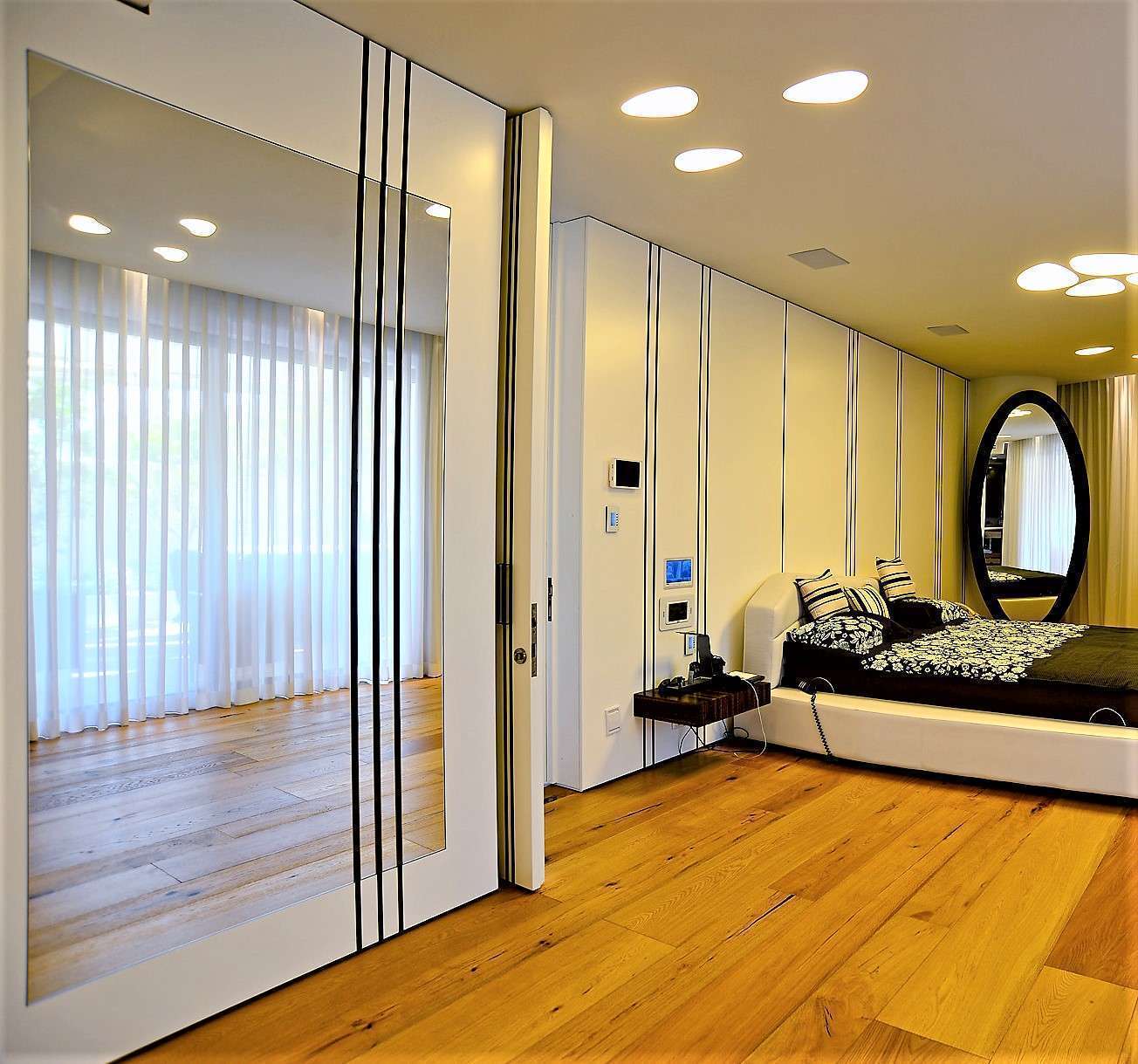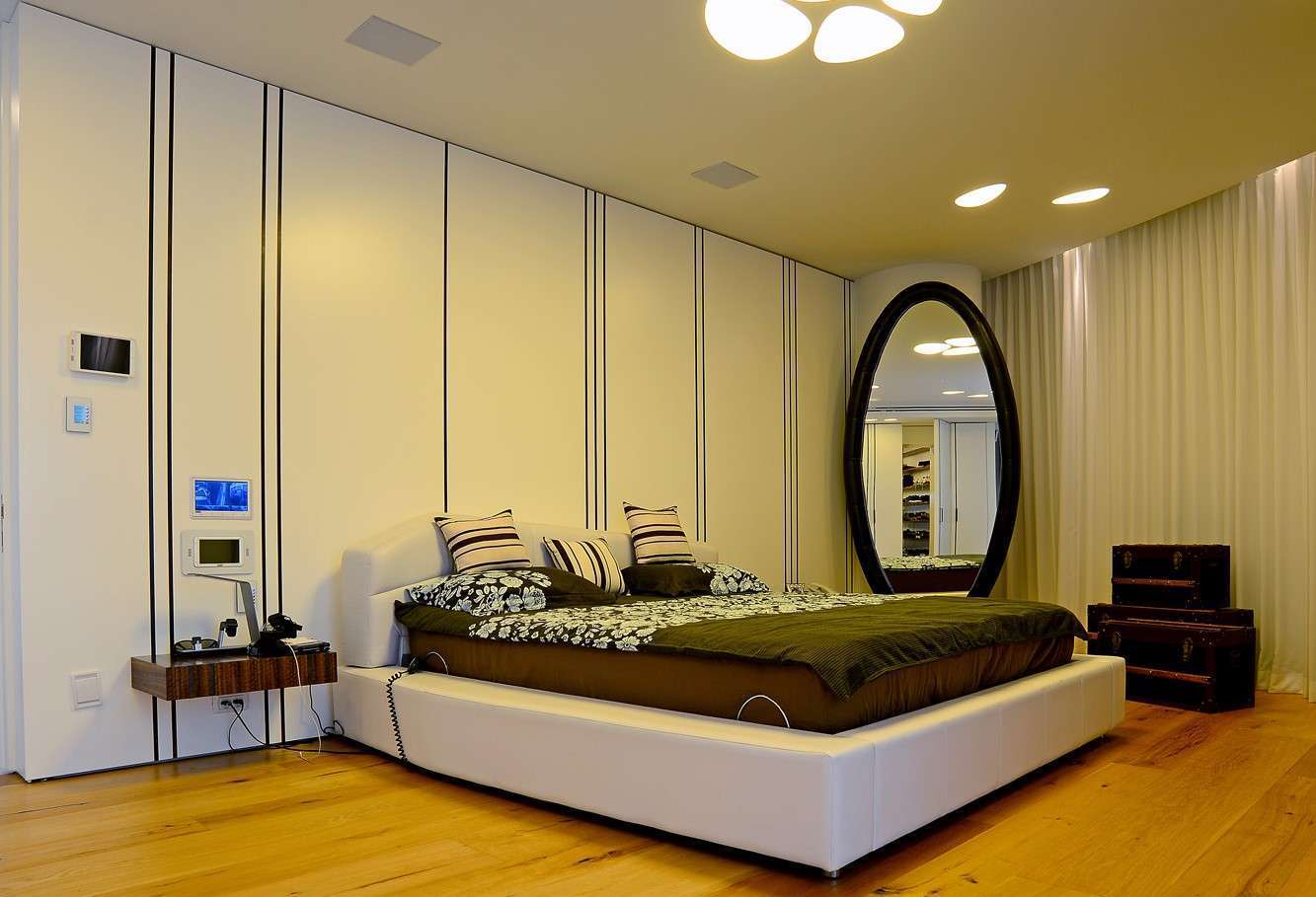 (מעטפת חיפוי קיר יוקרתית פונקציונלית בעלת טכנולוגיה חדשנית ואלמנטים יחודים משולב t.v > כמין > מראה אובלית מרופדת > ארון קיר משולב דלת סתרים > חדר ארונות > חדר אמבט)