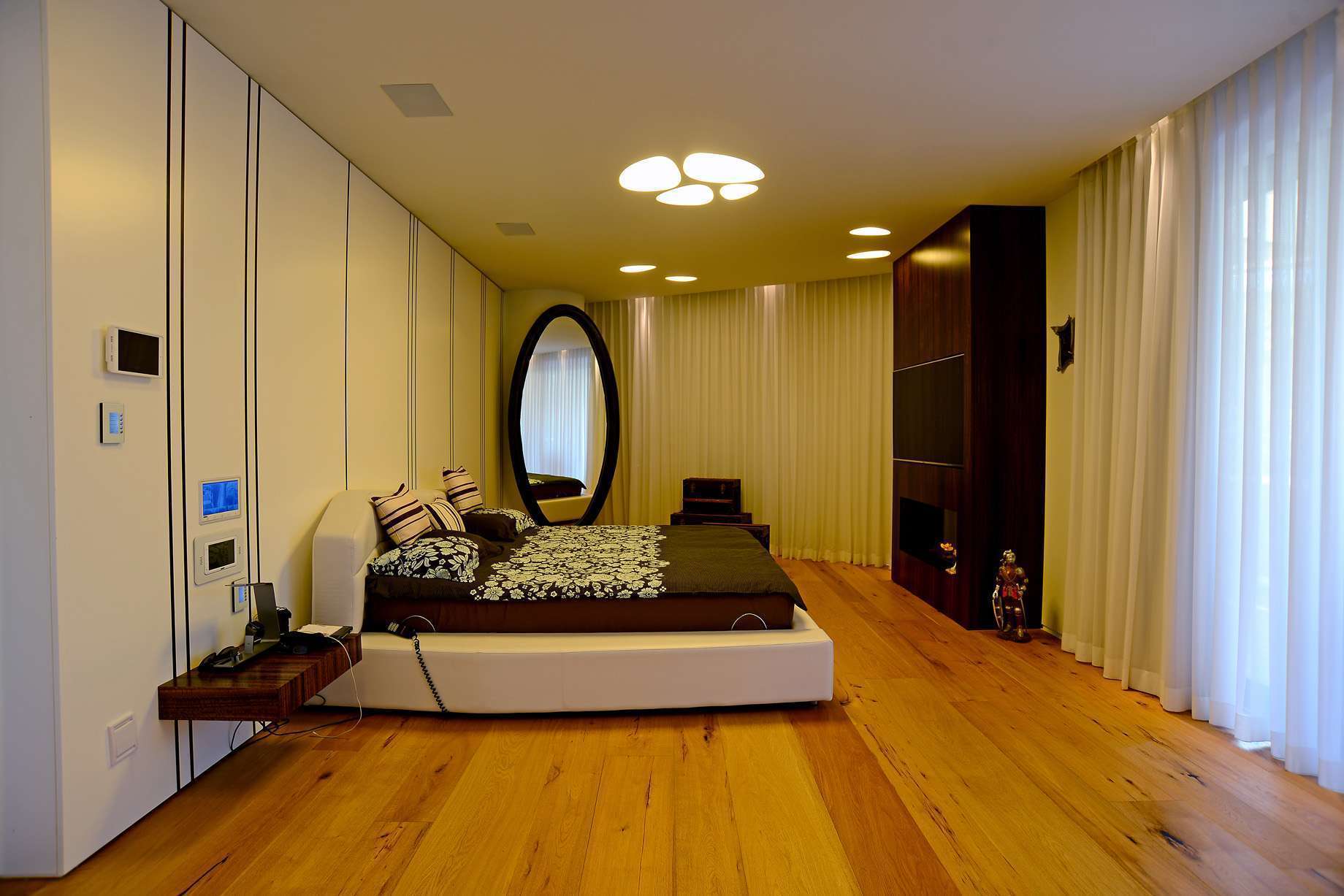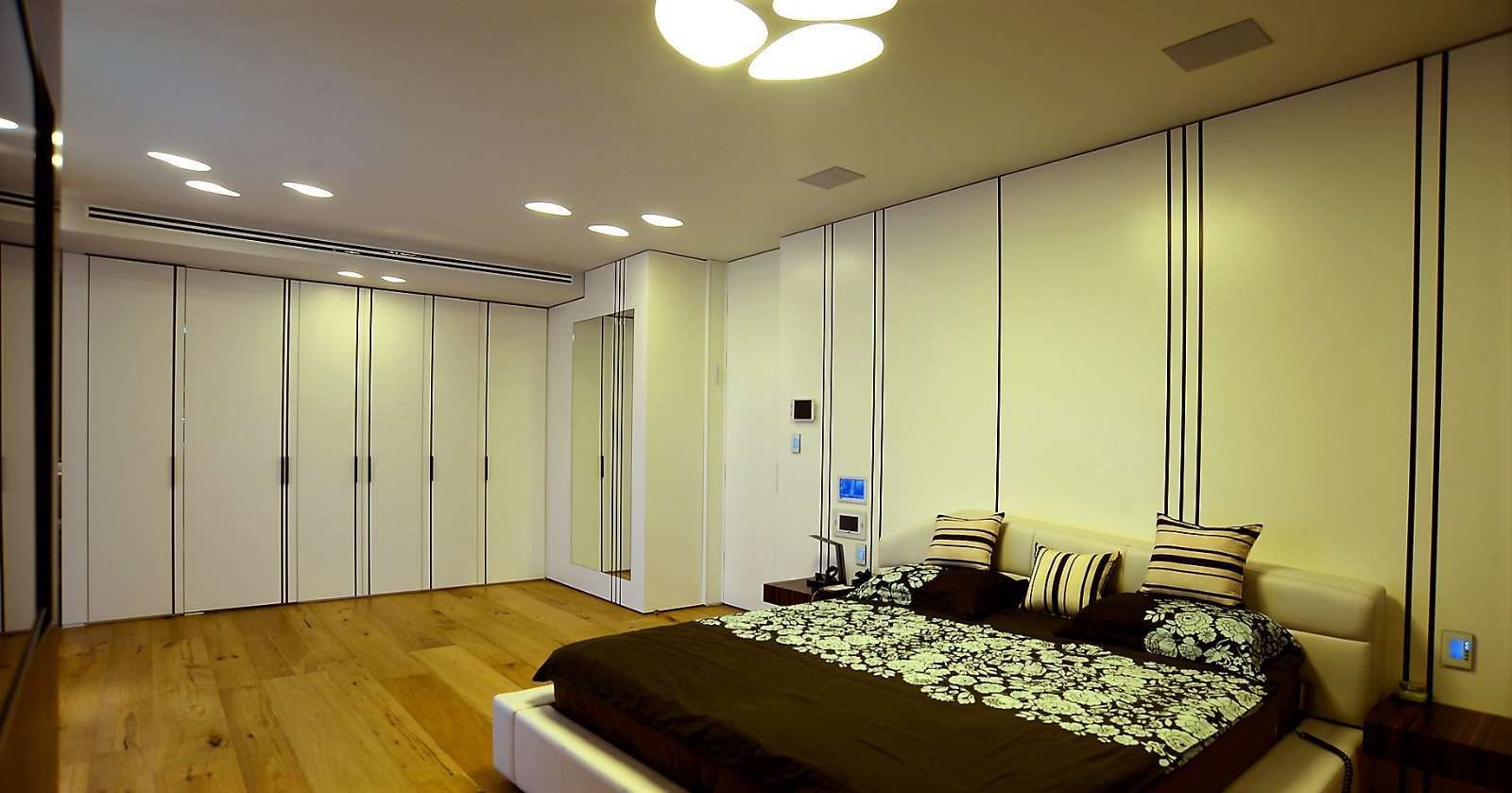 תיאור》החלל מציג קיר t.v משולב כמין מפורניר אקליפטוס המסתיר את ארובת הכמין, את העמוד התומך העגול אבזרנו במראה מתכוננת שבנויה בצורה אובלית במסגרת מרופדת בעור, וממשיך למעטפת חיפוי קיר מעץ בצבע לבן משולב שידות צד נשלפות מפורניר אקליפטוס באלמנט פליז מושחם(שינוי גוון מתכות באמצעות חומצות) מוטבע בתוך העץ לכל הגובה החיפוי משמש כראש מיטה ייחודי בו התקנו את צגי המדיה והחשמל חכם לשימוש נוח ואסתטי. בהמשך עטפנו את הקיר במראה ואלמנת הפליז בקו אפס אם החיפוי אותו ממשיך ארון קיר ומציג שוב את אלמנט הפליז הפעם מרותח ומאובזר כידית אחיזה לפתיחת ארונות ודלת הכניסה לחדר ארונות המציג 2 חיפויי קיר מעוצבים במידוף עץ צפים בחיתוחים בצורת טרפז שונים לאיחסון הנעליים ממשיך לתחנת המידוף הפינתי הנתמך על ידי קונסטרוקצית ברזל סמויה בתוך המדפים שאותם אבזרנו בתאורת לד, מלמטה תחנת התליה ומגירות נשלפות לאיחסון.