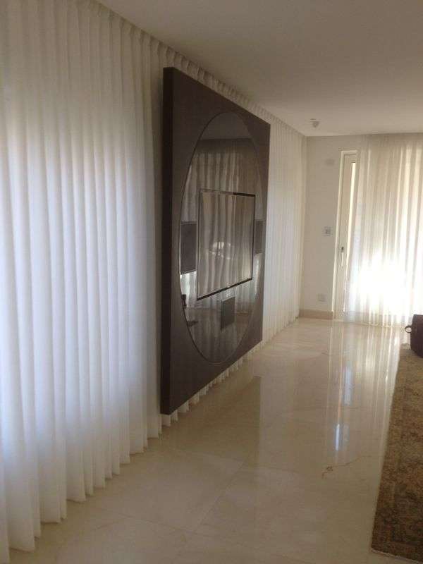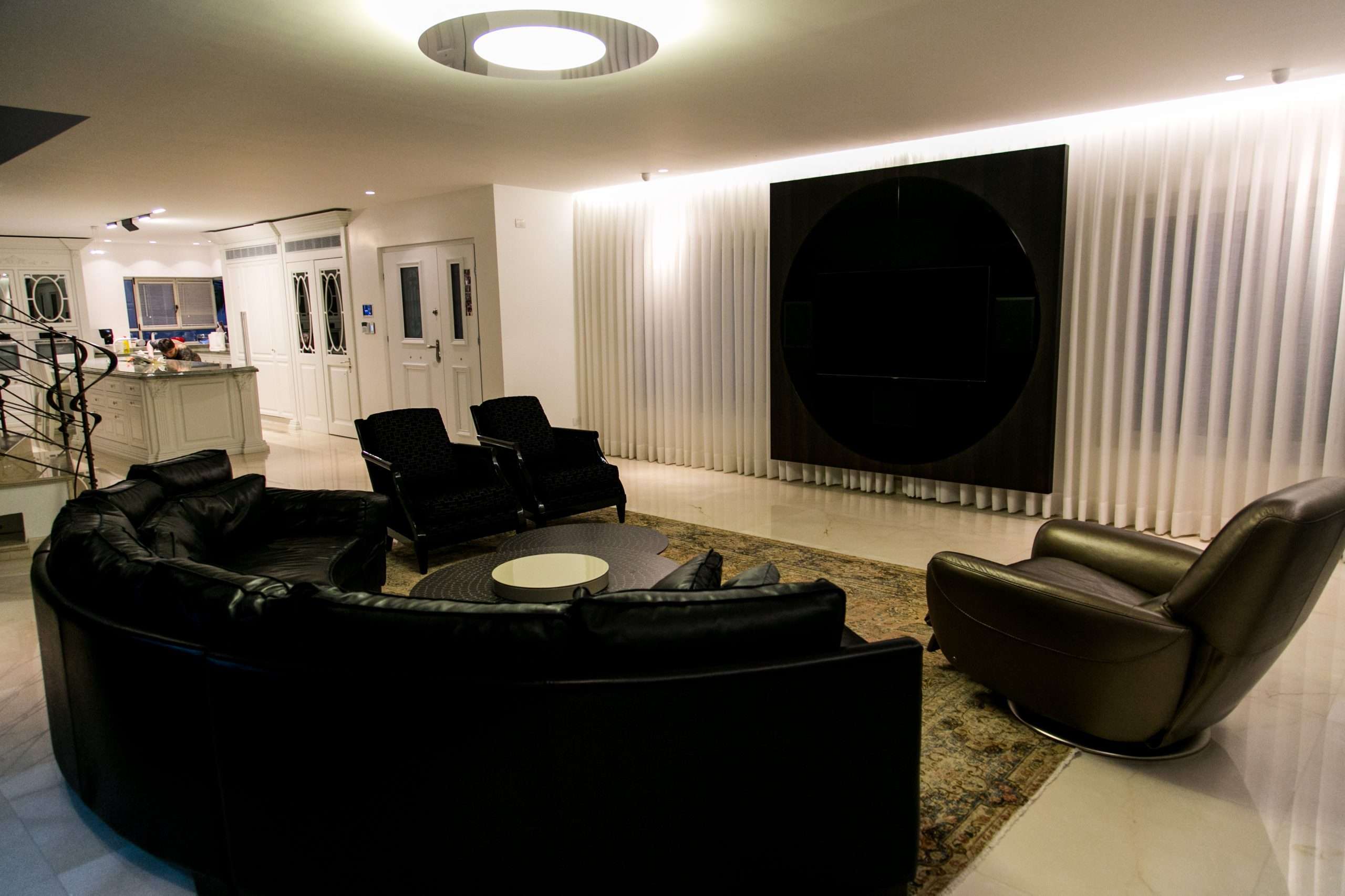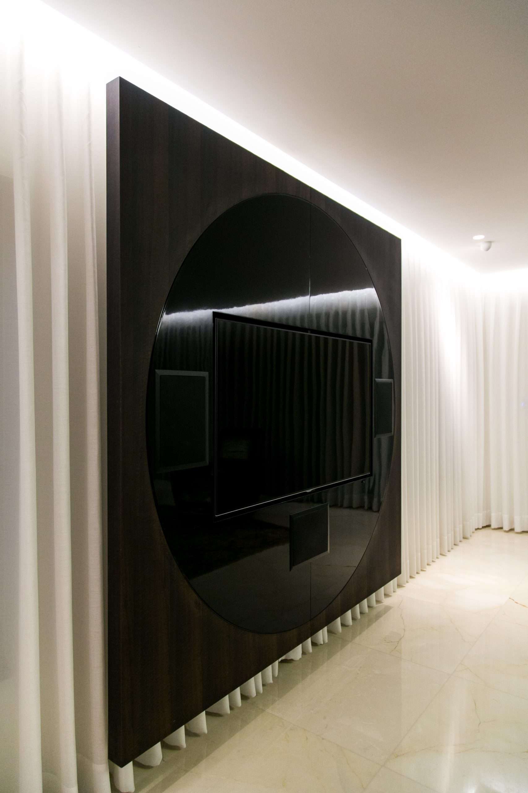 תיאור》חיפוי קיר מעטפת חיצונית בגימור פורניר אקליפטוס במפגש המעגל שחור מבריק בו הוטמעו ה t.v רמקולים וסנטר מציג מישור אחד בקו אפס בהתקנה מרחפת מהקיר המאפשר לוילונות תנועה מלאה שעוברת מאחורי החיפוי לכל אורך הוטרינה.