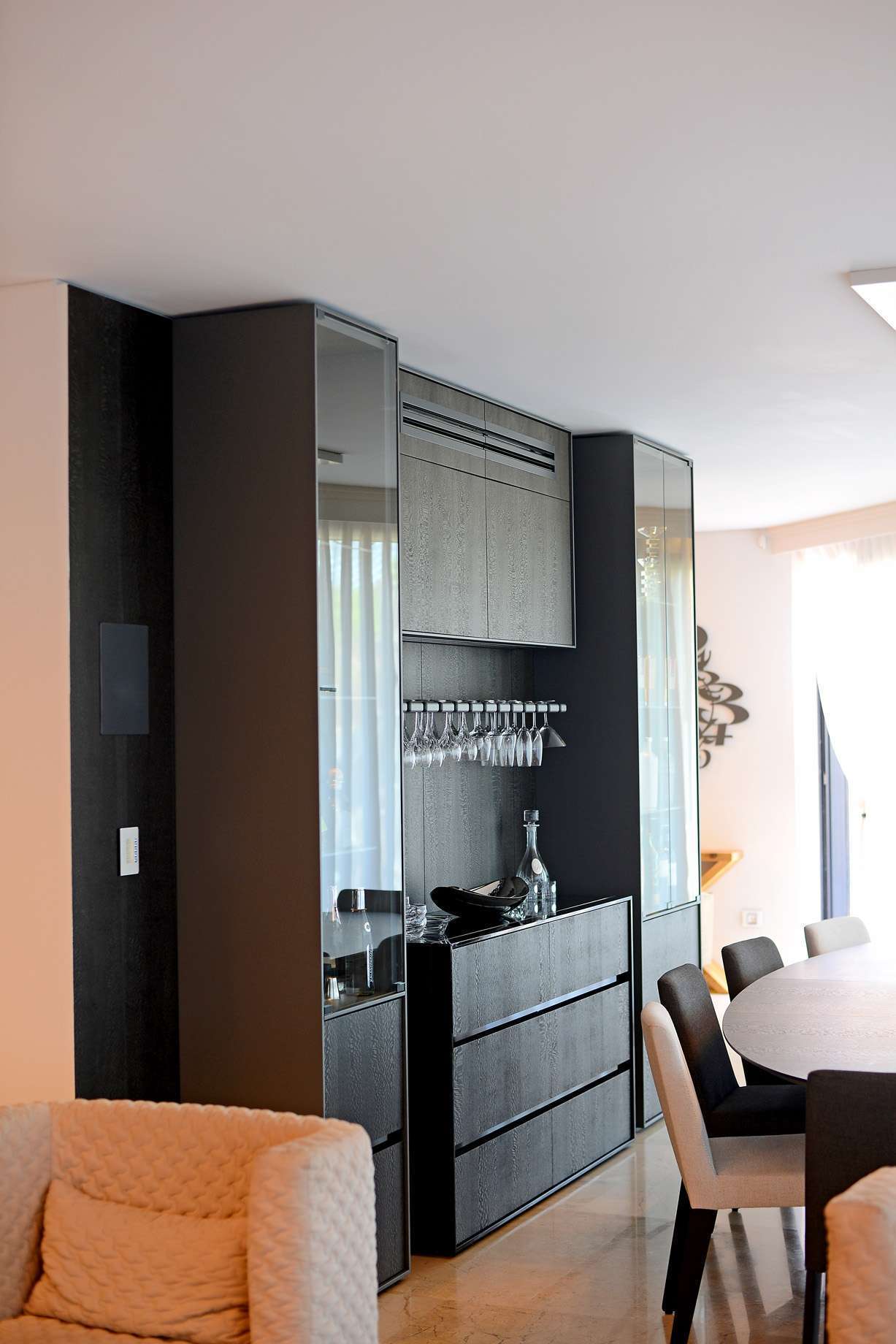 תיאור》מערכת בר בגימור קנטים מדוקקים פורניר אקליפטוס מקומר מושחר וצבע שחור משולבת וטרינות ומדפי זוכיכת חיפוי צד בגימור פינה 45 מעלות אם הגבס בו הוטמעו חשמל חכם ורמקול חיפוי מרכזי מציג אביזר מחזיק כוסות מעוצב בהתאמה לגודל בשילוב מערכת מיזוג עליונה נגישה מוסתרת בנגרות יחידת מגירות איחסון מעוצבת בידית במה מובנת בעבודת יד לפתיחה נוחה