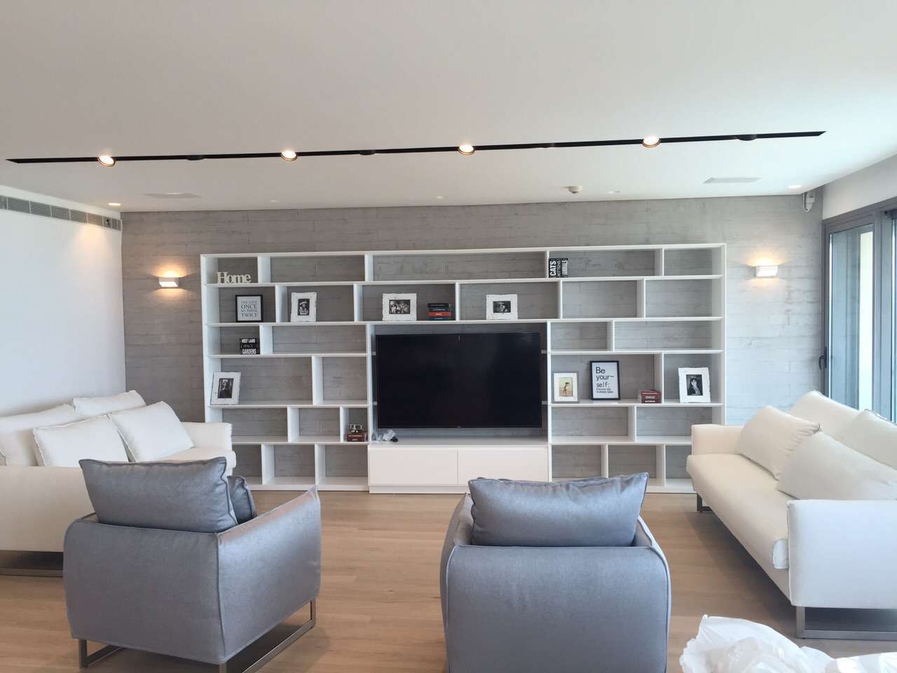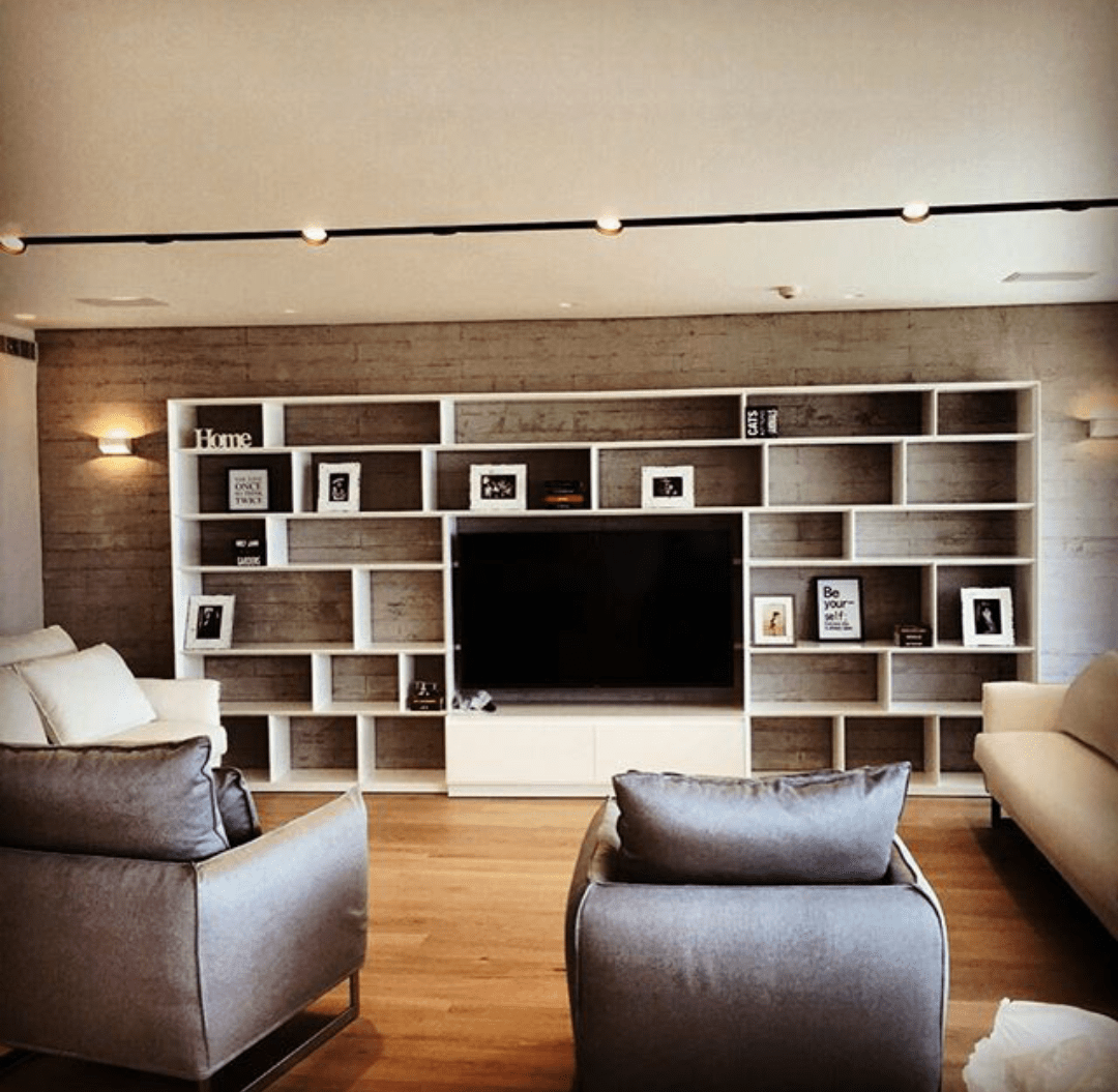 תיאור》ספרייה ללא גב אחורי משולבת t.v בגימור קנטים מדוקקים בסגנון הייטק מדף חובק דופן מחיצות חובק מדף משולבת t.v ויחידת אחסון תחתונה מעוצבת בידית במה מובנת לפתיחה נוחה