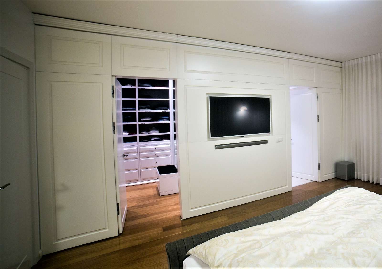 תיאור》חיפוי קיר מעץ בצבע בגוון לבן בסגנון פרובנס מעותר בקרניז מילואה בחריטה במרכז החיפוי התמענו את ה t.v הרמקול ומתגי החשמל. עבור שני החללים הנוספים חדר רחצה וחדר ארונות יצרנו פתחים לדלתות הכניסה כולל משקופים שנאחזים בחיפוי כיחידה אחת וממשיך לחדר ארונות מעוצב נגיש ומאובזר אותו בנינו מתחנת התליה המידוף והמגירות ממשיך לחיפוי מראה וארון מידוף פנימי נשלף. וכשהדלתות סגורות החיפוי מציג מישור אחד ללא נסיגות ומסתיר את החללים בקו נקי מדויק ונעים.