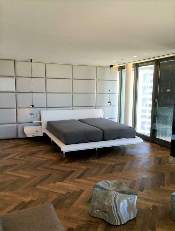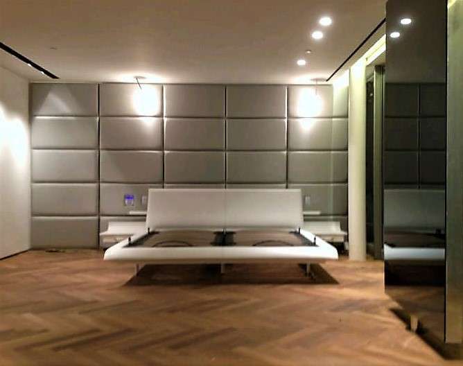 תיאור》חיפוי קיר מרופד משולב דלת כניסה לחלל נוסף החיפוי מוצג כראש מיטה אקוסטי בו הטמענו את מתגי החשמל חכם והמדיה. ומעוצב בסגנון ארחים מרופדים. ספק בדים ראנבי