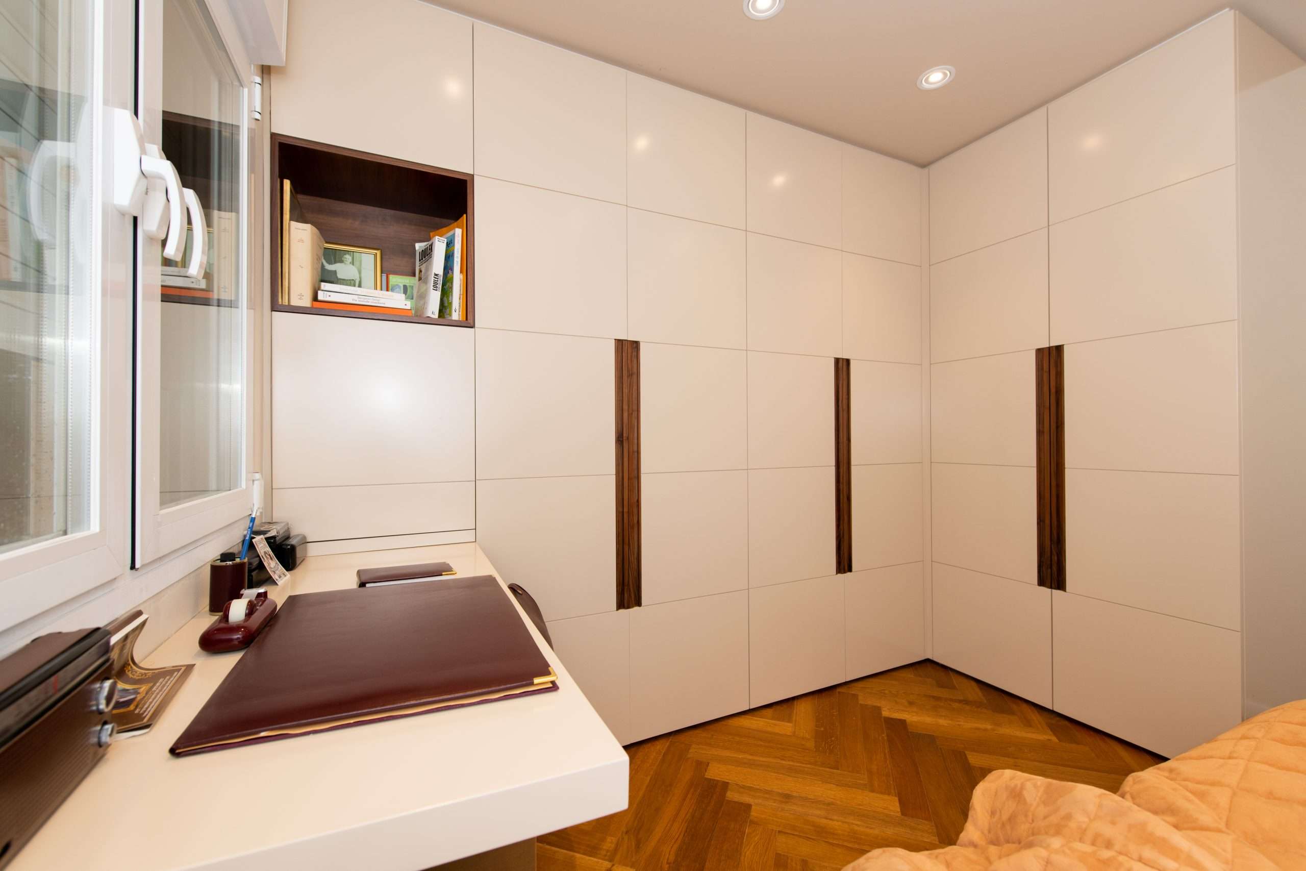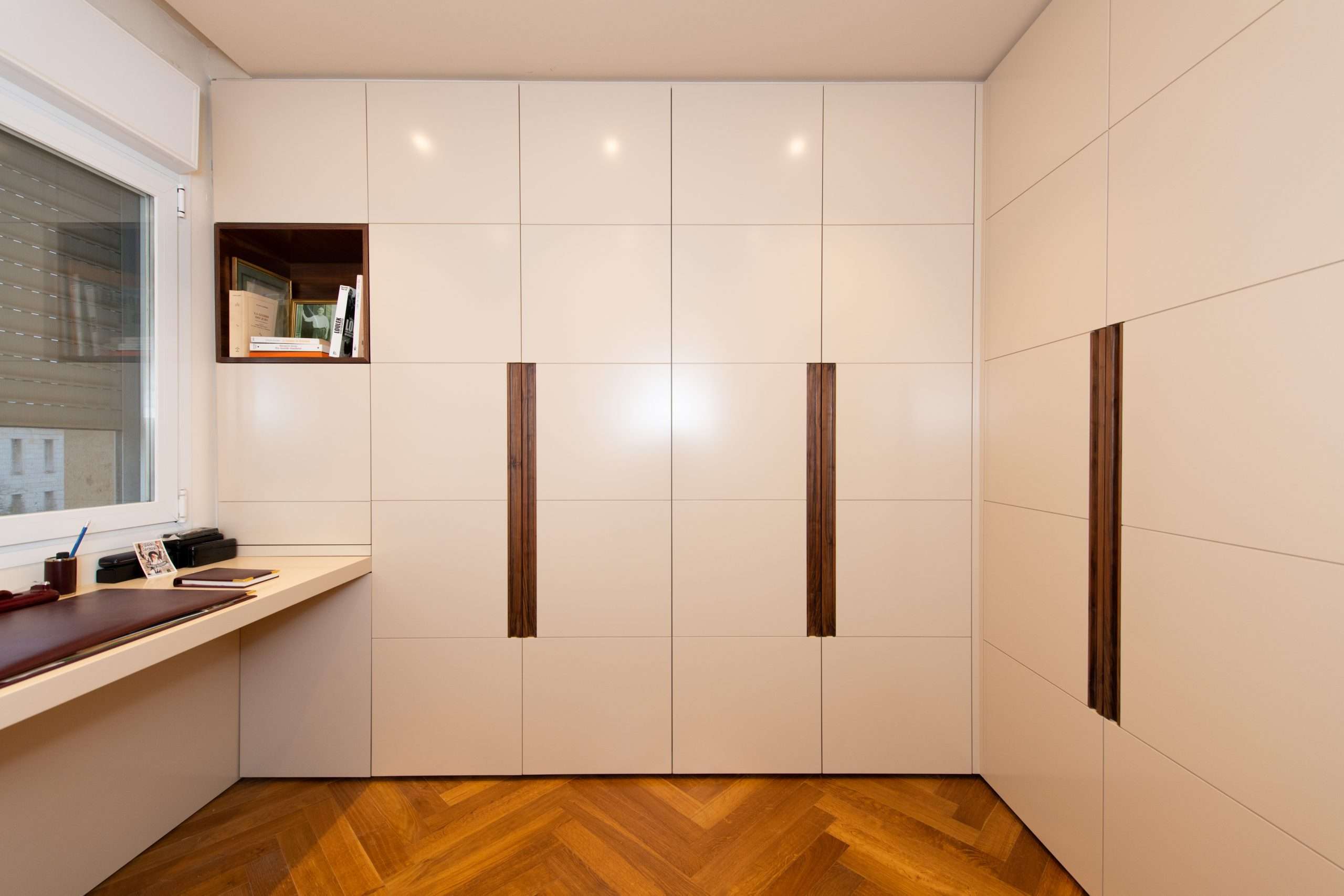 תיאור》ארון קיר פינתי מאובזר במדפים תליה ומגרות נשלפים לניצול שטח איחסון מקסימלי צבע בגוון קפה מעוצב בחריצים עדינים וידיות מעץ אגוז אמרקאי חרותות לאחיזה אותם הטמענו בתוך הדלת שתאפשר פתיחה נעימה. ארון משלב את השולחן עבודה ושטח איחסון נוסף בדלת שמתחת לשולחן וכן הלאה מעליו ממשיך עד לתיקרה.
