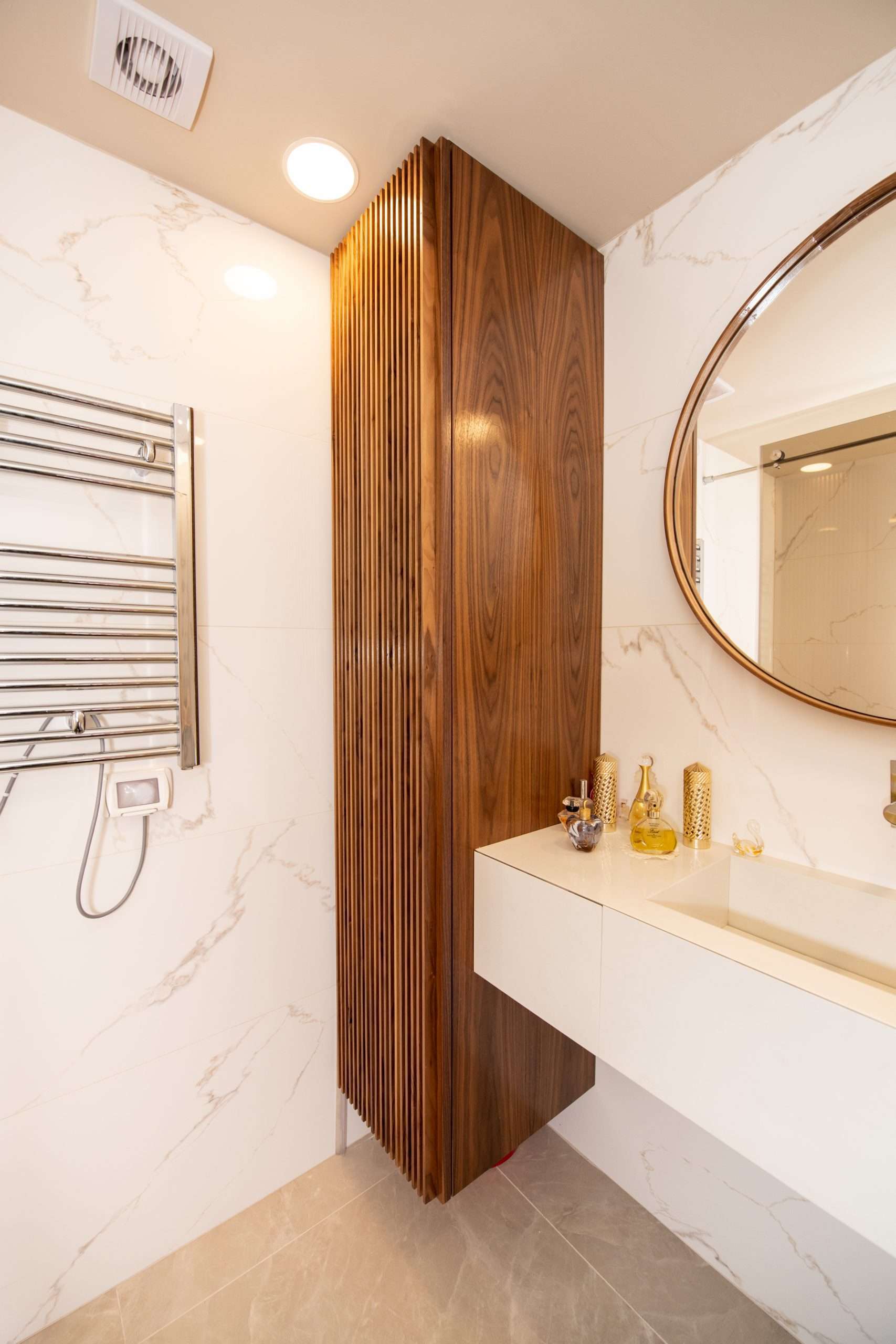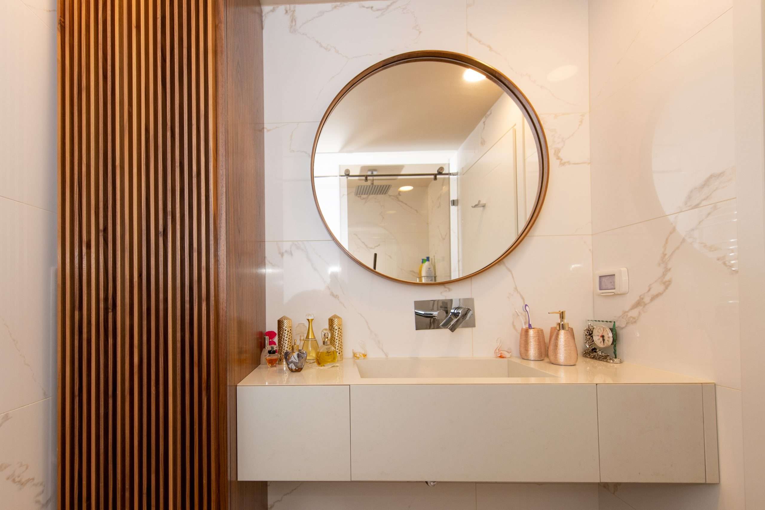 [ארון אמבט צף משולב מראה שיש ועץ אגוז אמרקאי]